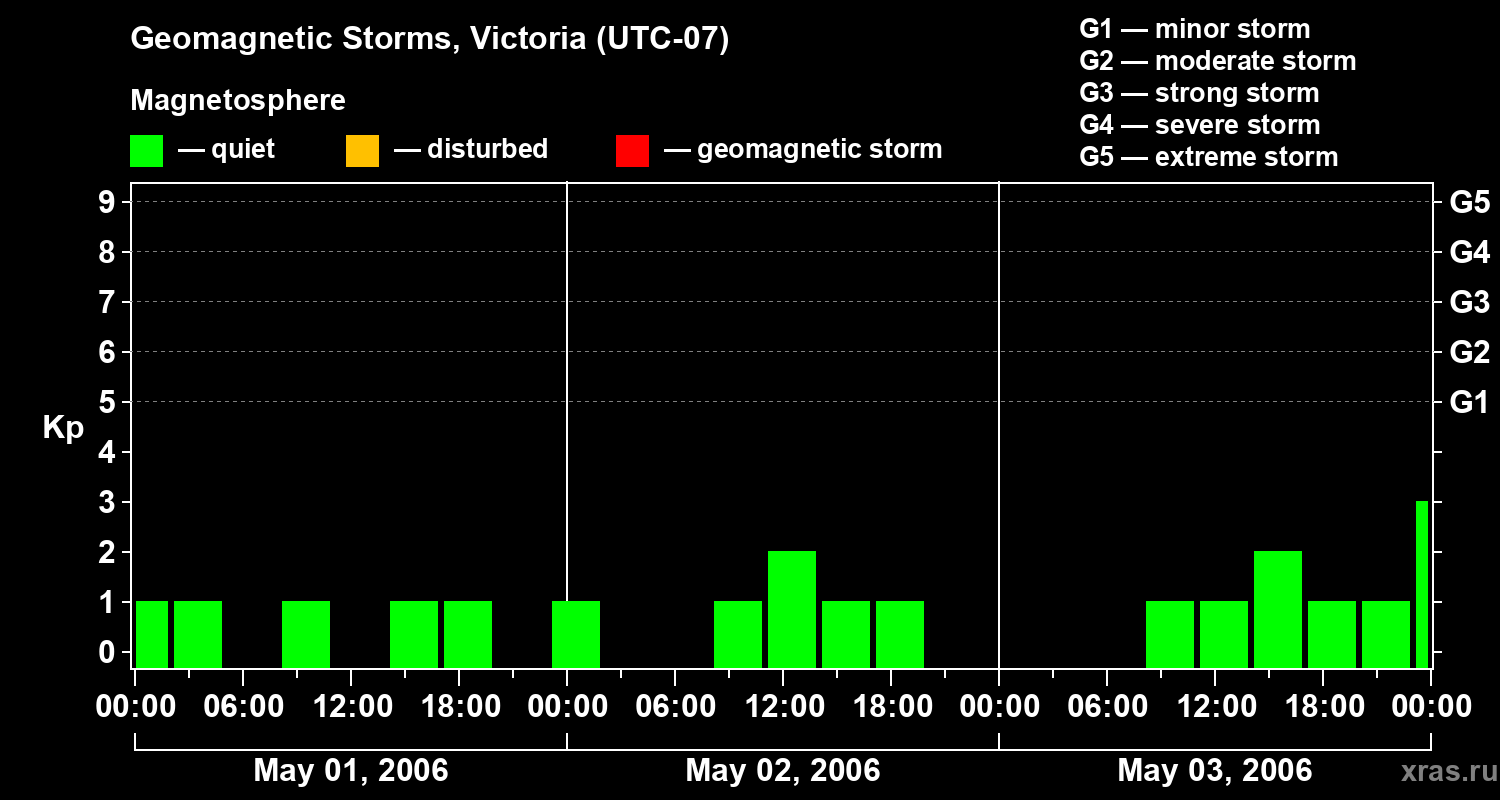 Changes in the geomagnetic index Kp from May 1 to 3, 2006 for mid latitudes