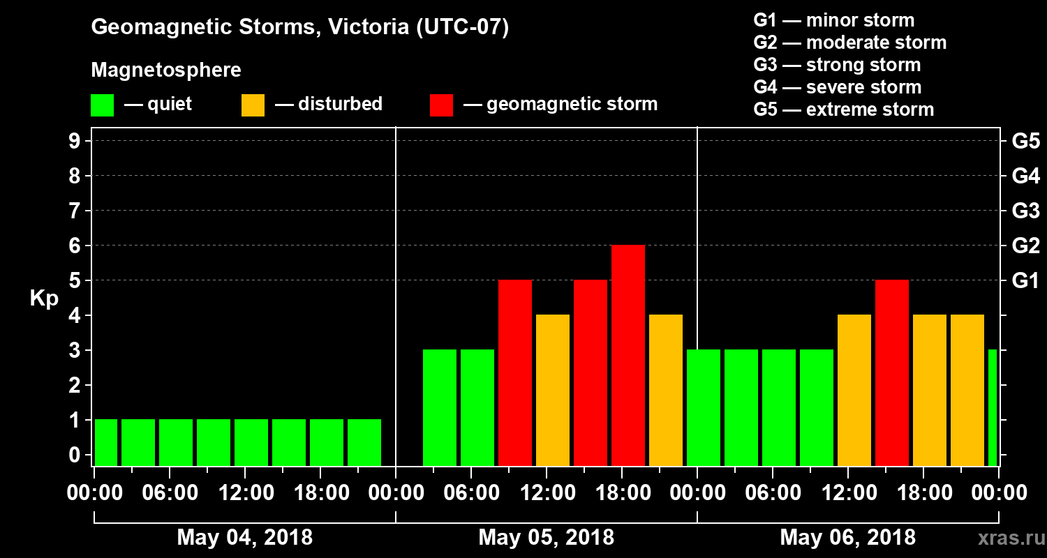 Changes in the geomagnetic index Kp from May 4 to 6, 2018 for mid latitudes