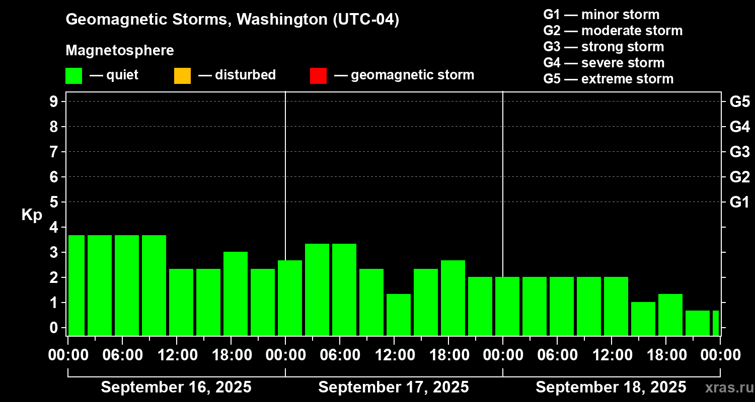 Changes in the geomagnetic index Kp from September 16 to 18, 2025 for mid latitudes