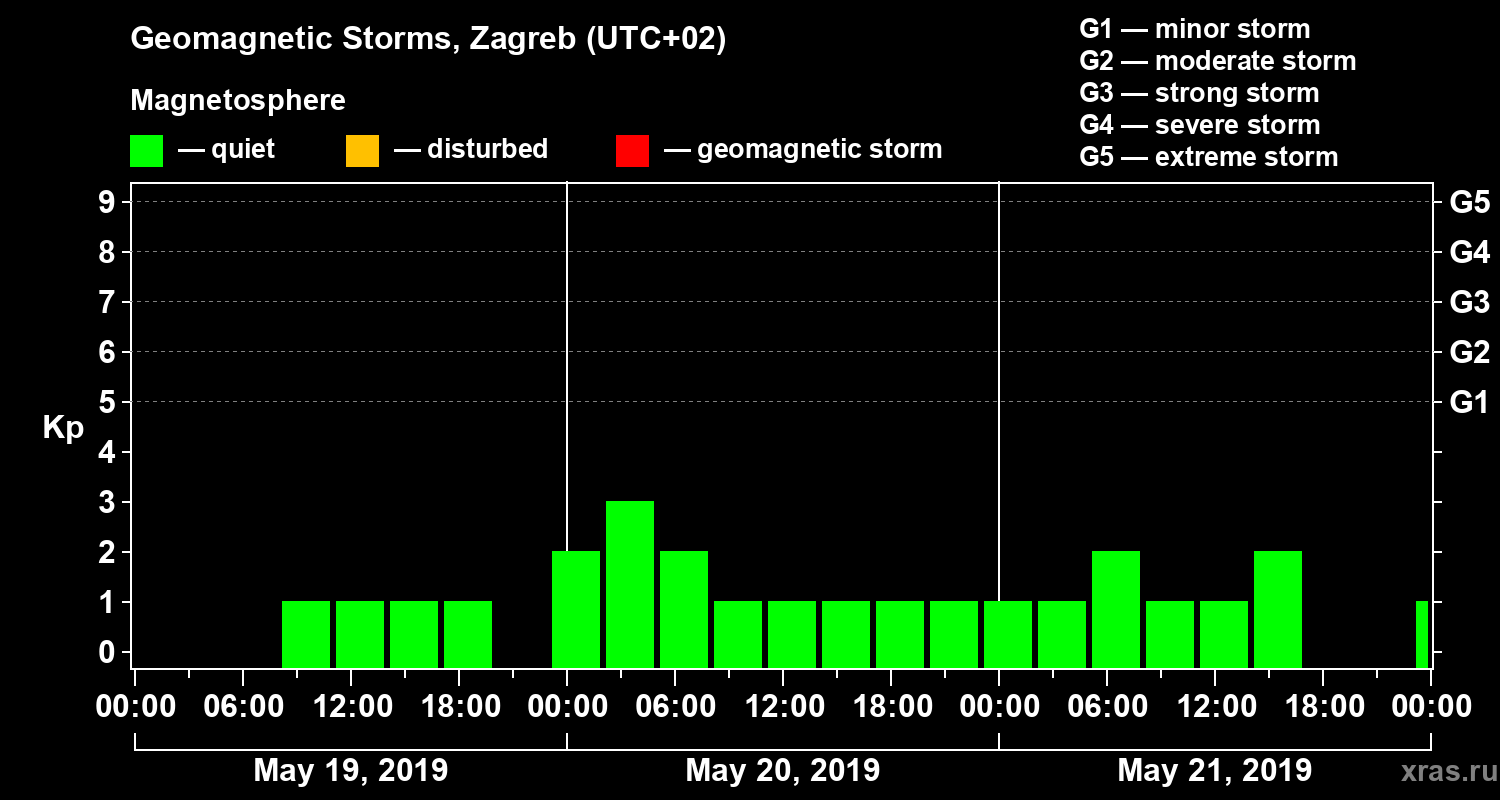 Changes in the geomagnetic index Kp from May 19 to 21, 2019 for mid latitudes