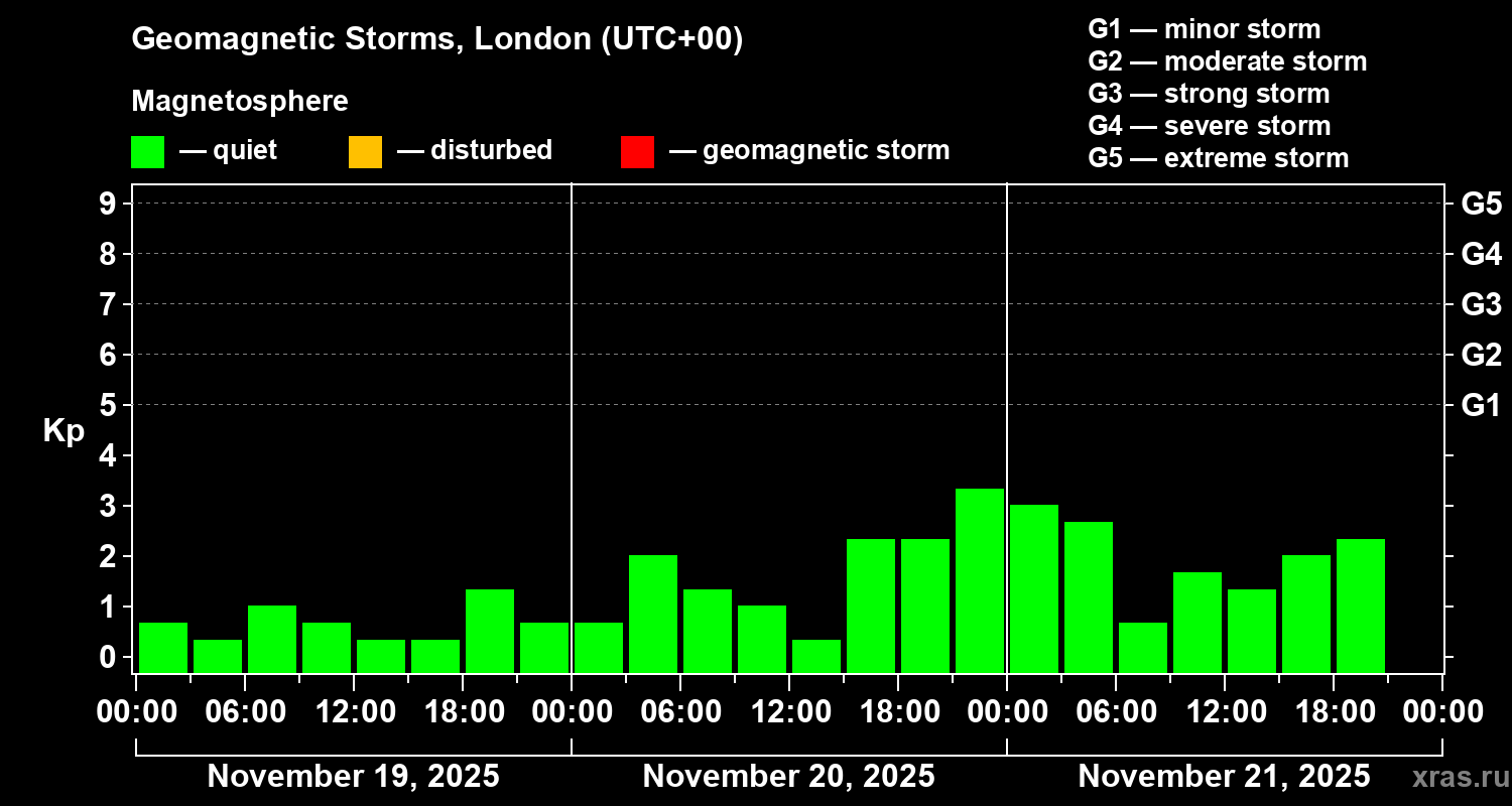 Changes in the geomagnetic index Kp from November 19 to 21, 2025 for mid latitudes