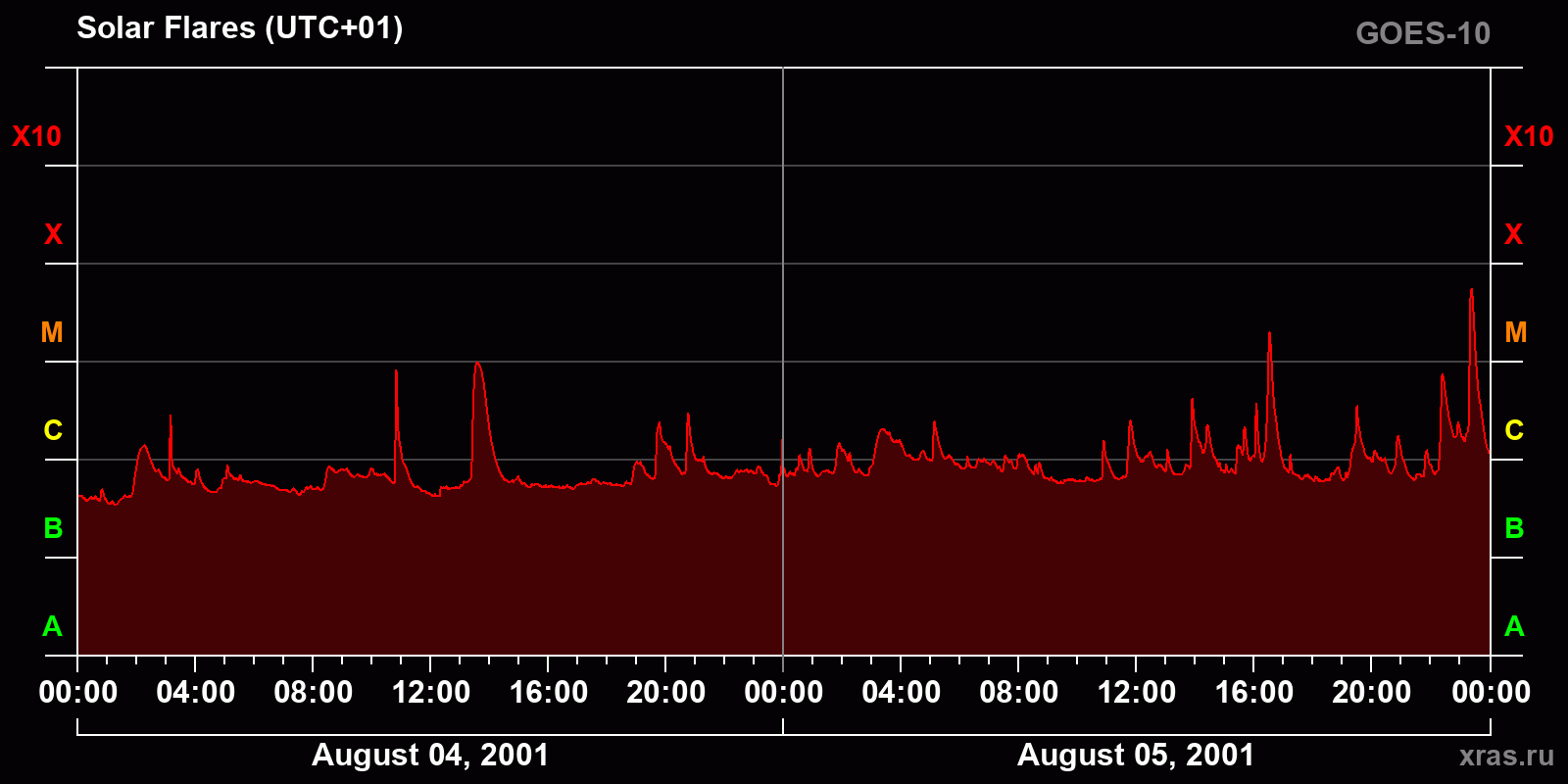 Chart of solar activity from Aug 04, 2001 to Aug 05, 2001