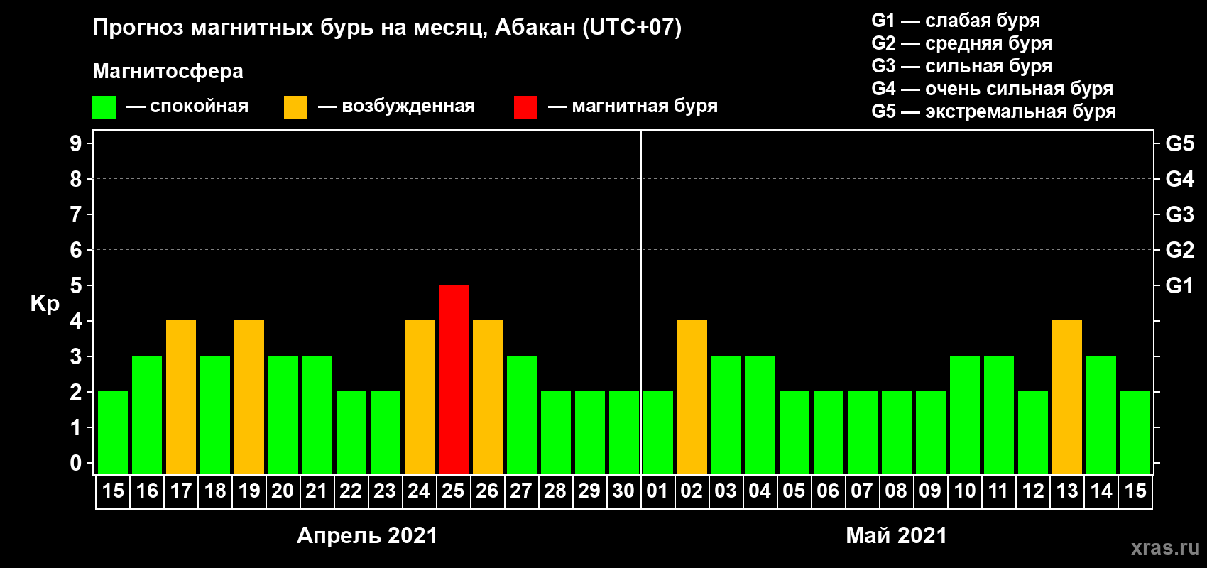 Прогноз магнитных бурь в Абакане на 15 апреля 2021 года