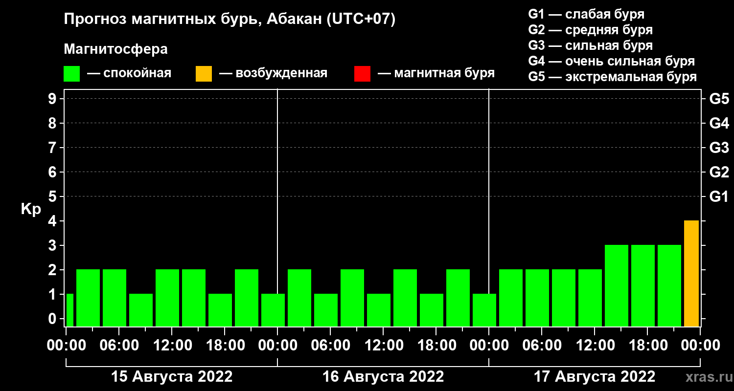 Прогноз магнитных бурь в Абакане на 15 августа 2022 года