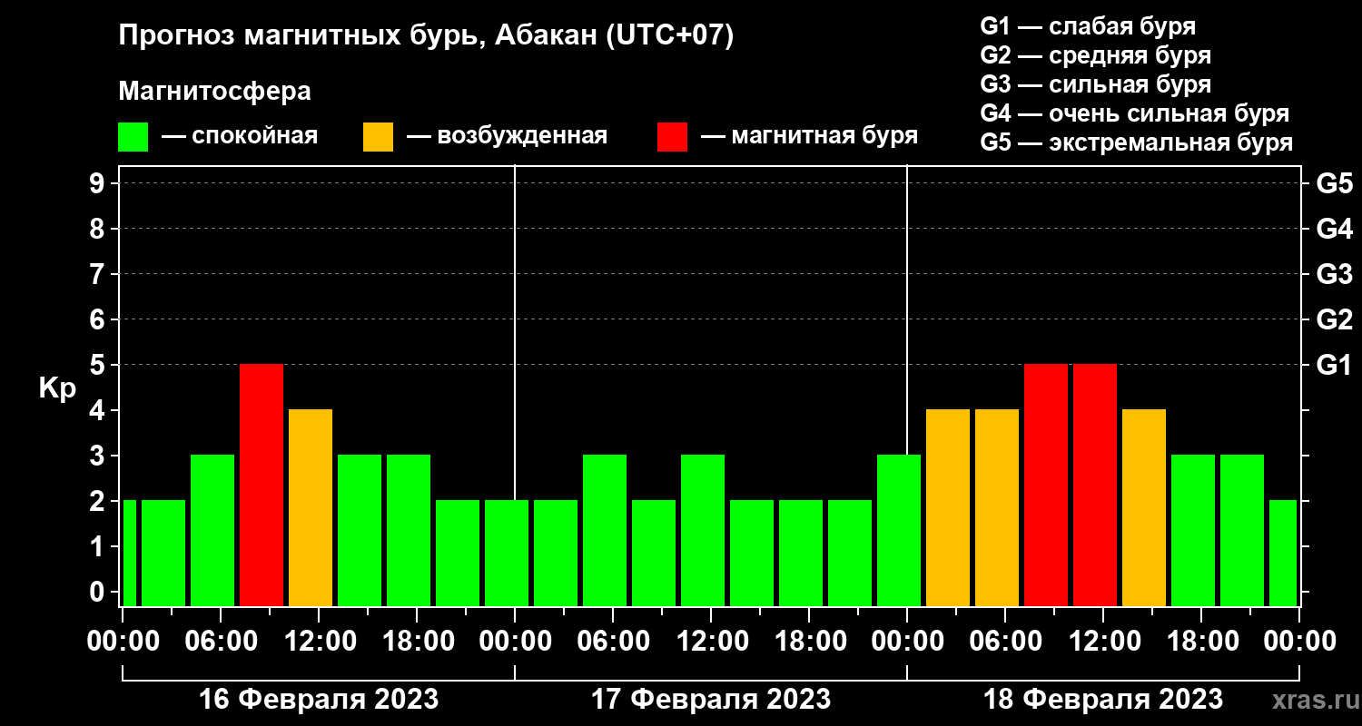 Прогноз магнитных бурь в Абакане на 16 февраля 2023 года