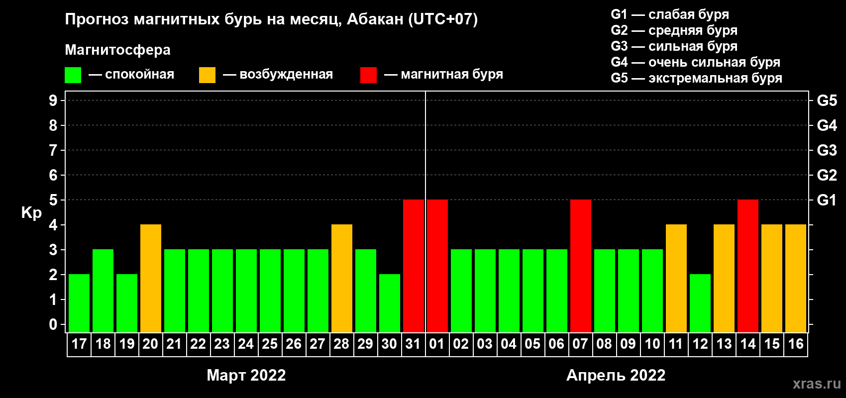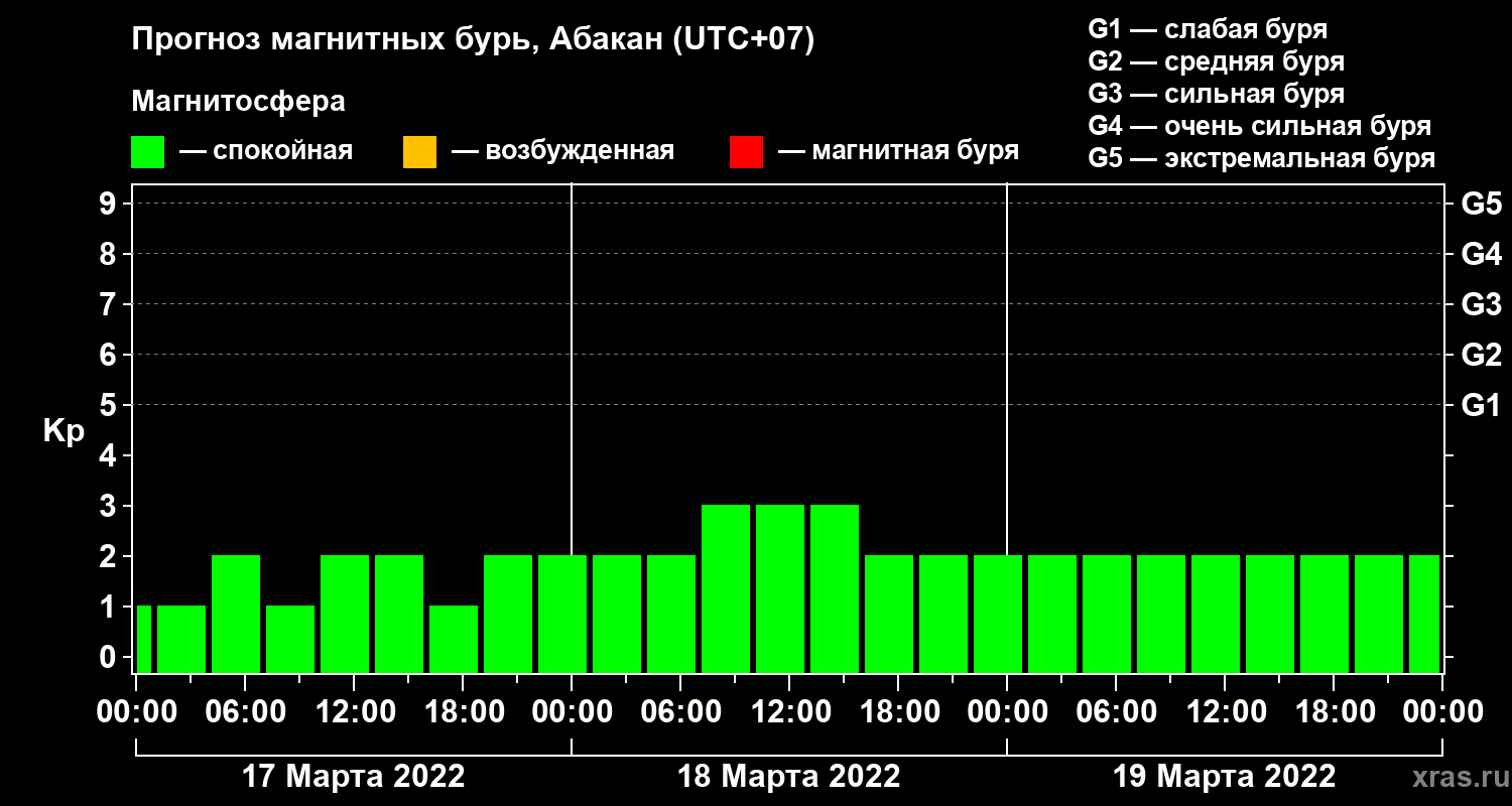 Прогноз магнитных бурь в Абакане на 17 марта 2022 года