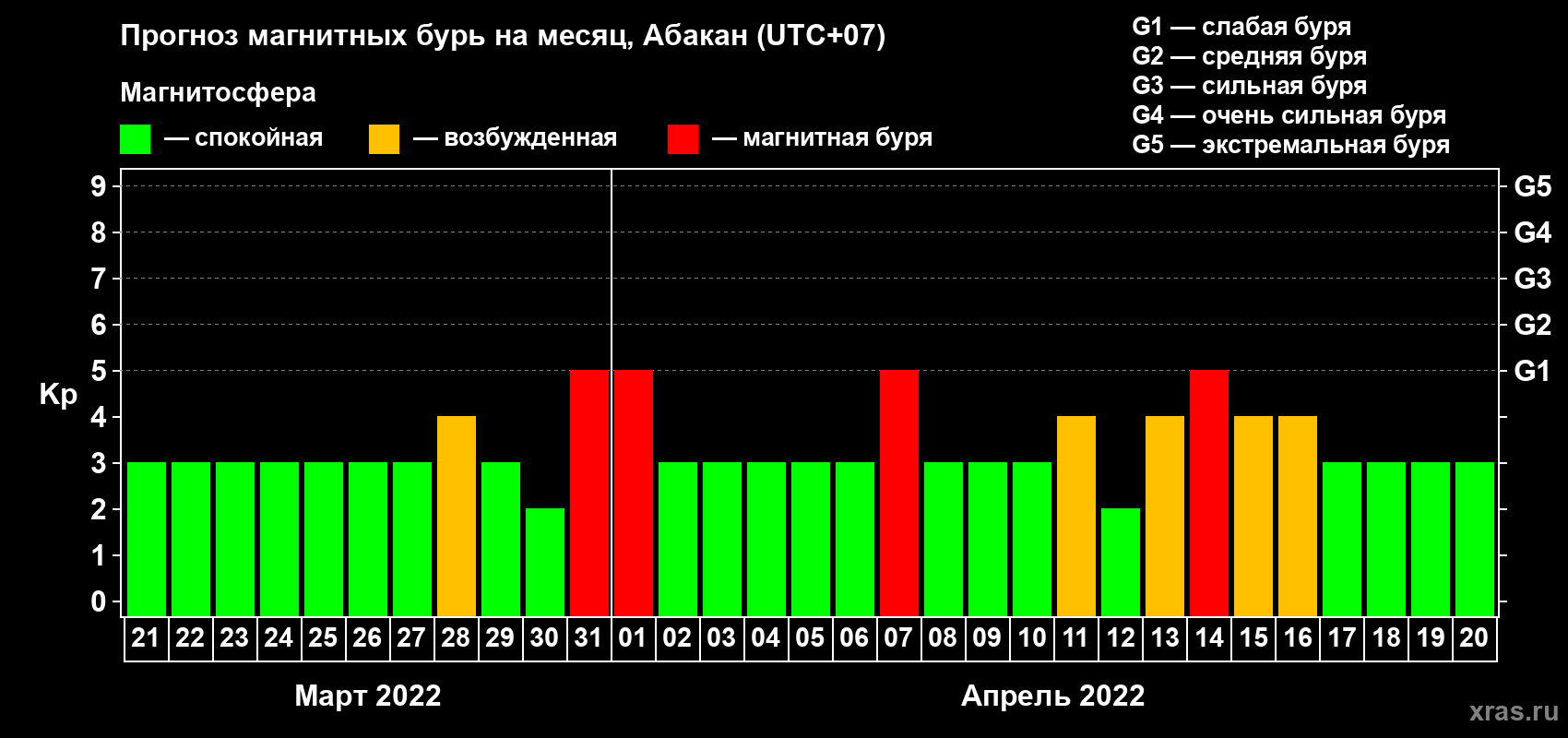 Прогноз магнитных бурь в Абакане на 21 марта 2022 года