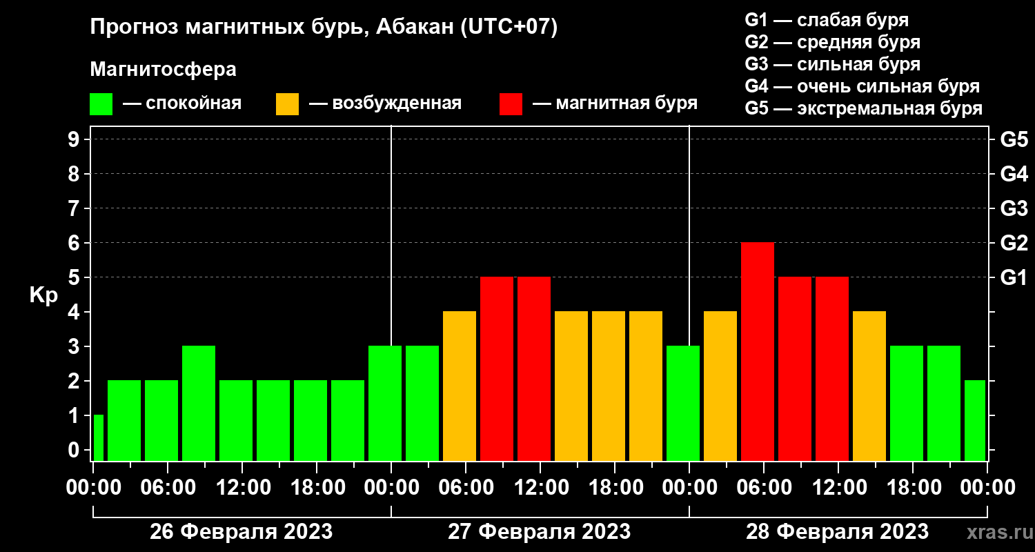 Прогноз магнитных бурь в Абакане на 26 февраля 2023 года