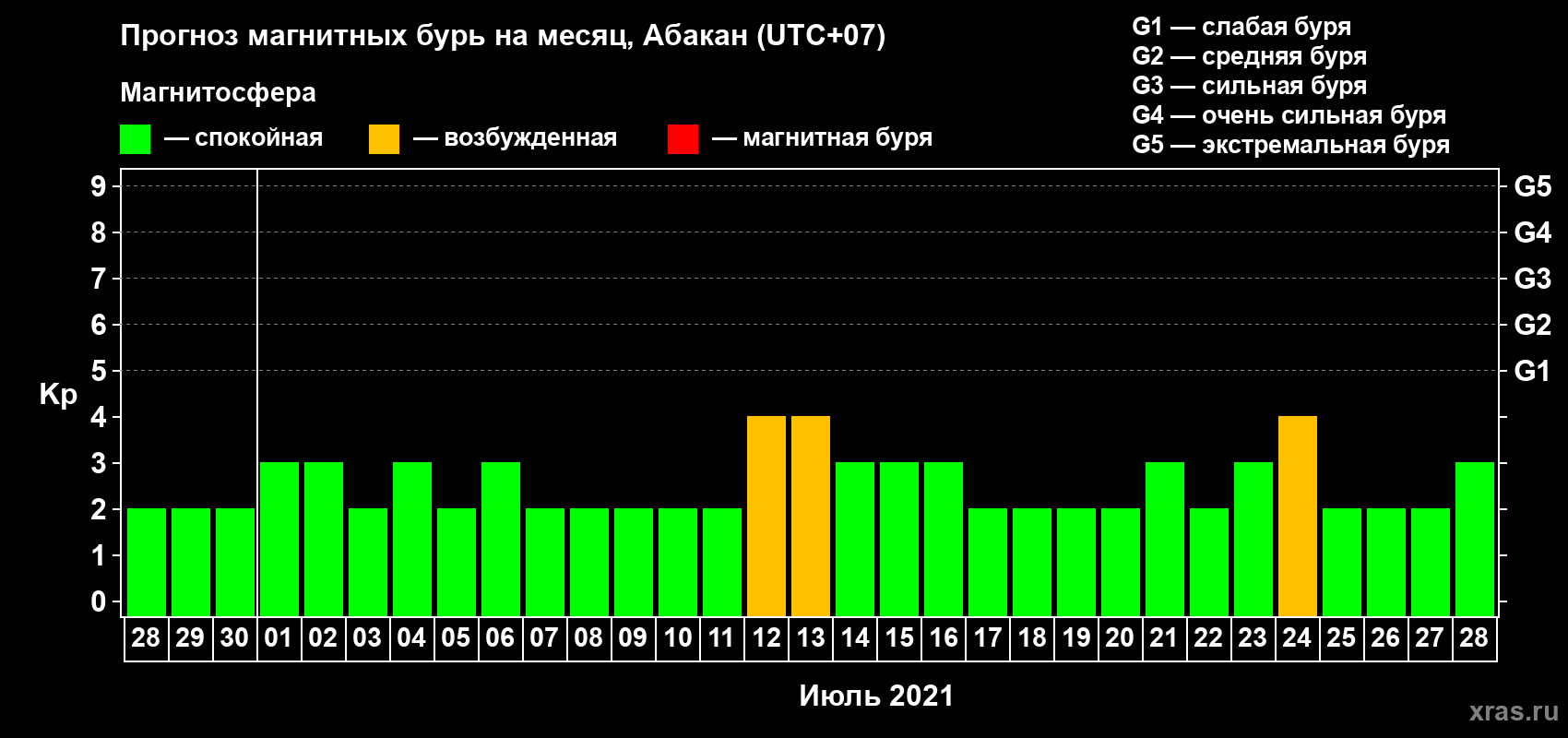 Прогноз магнитных бурь в Абакане на 28 июня 2021 года