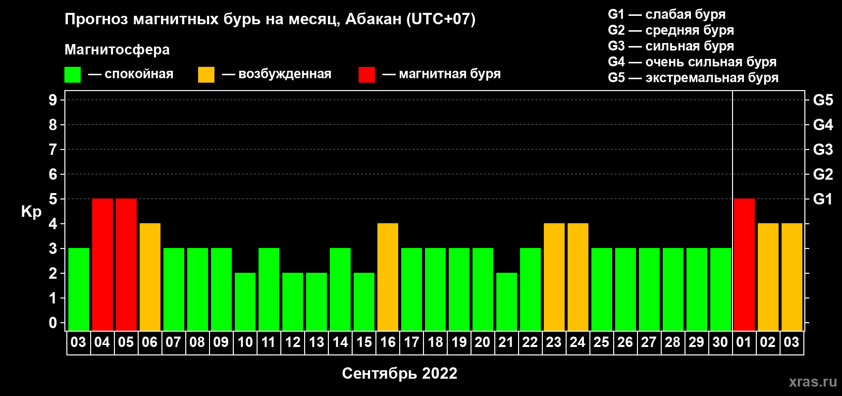Прогноз магнитных бурь в Абакане на 3 сентября 2022 года