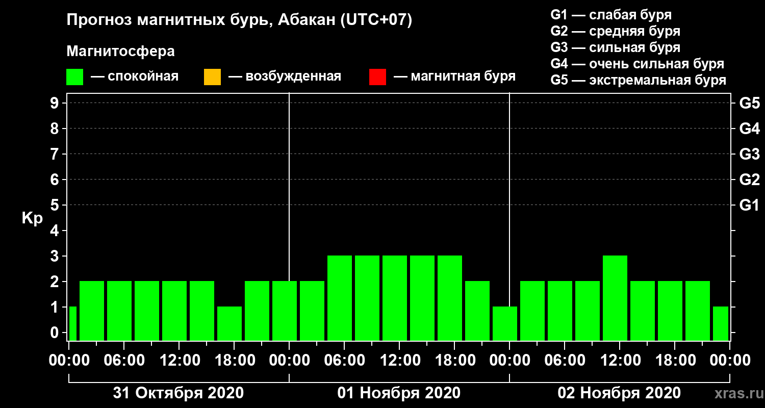 Прогноз магнитных бурь в Абакане на 31 октября 2020 года