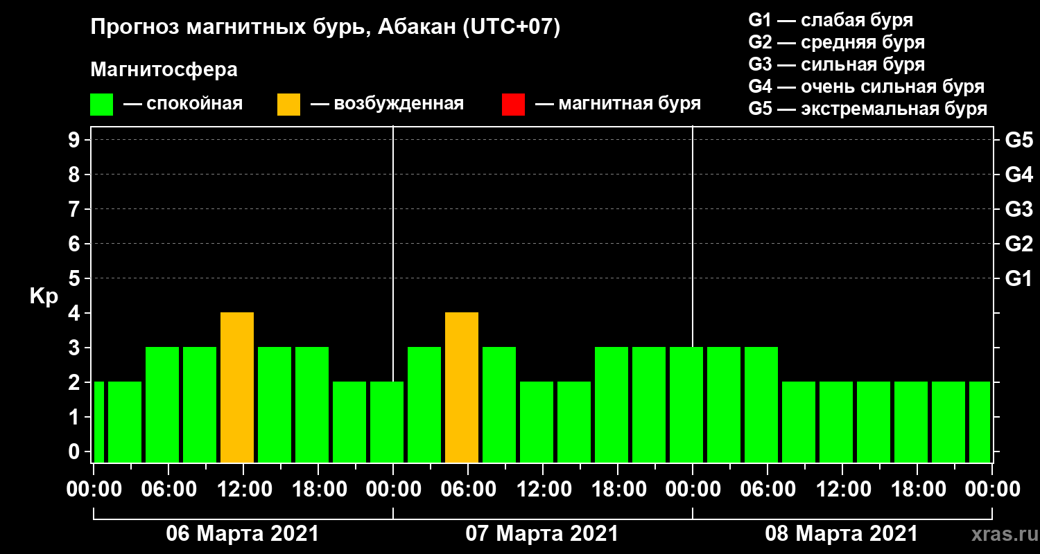 Прогноз магнитных бурь в Абакане — 6 марта 2021 года