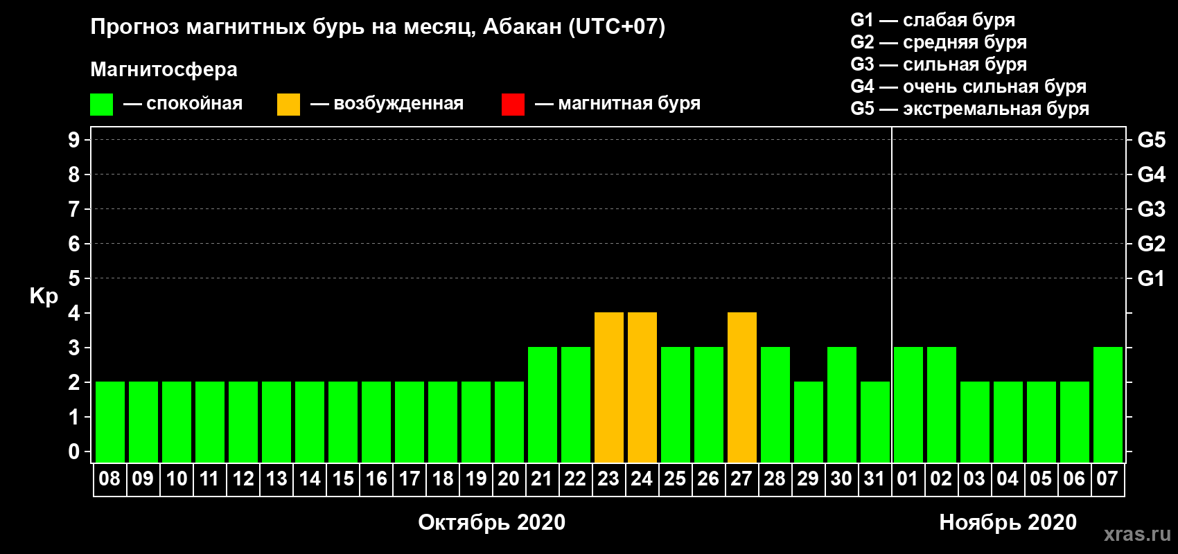 Прогноз магнитных бурь в Абакане на 8 октября 2020 года