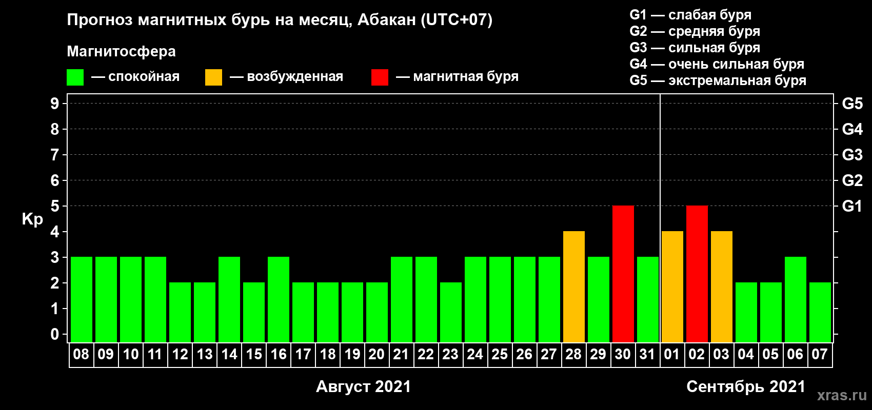 Прогноз магнитных бурь в Абакане на 8 августа 2021 года