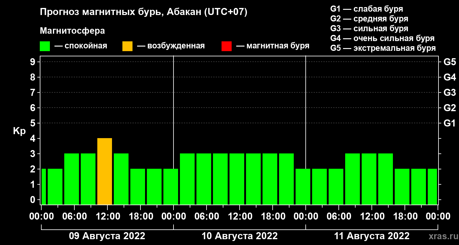 Прогноз магнитных бурь в Абакане на 9 августа 2022 года