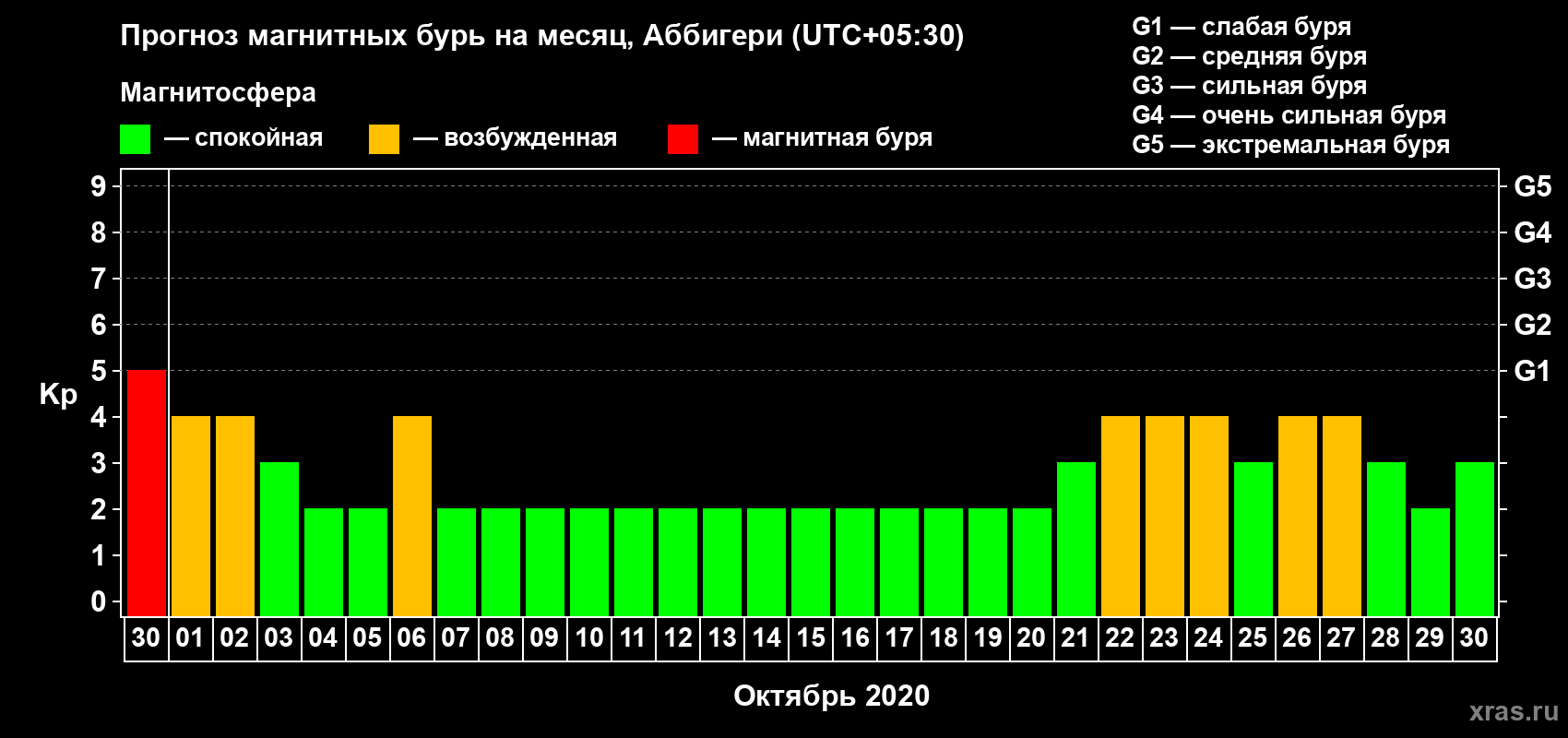 Прогноз магнитных бурь Аббигери на 30 сентября 2020 года