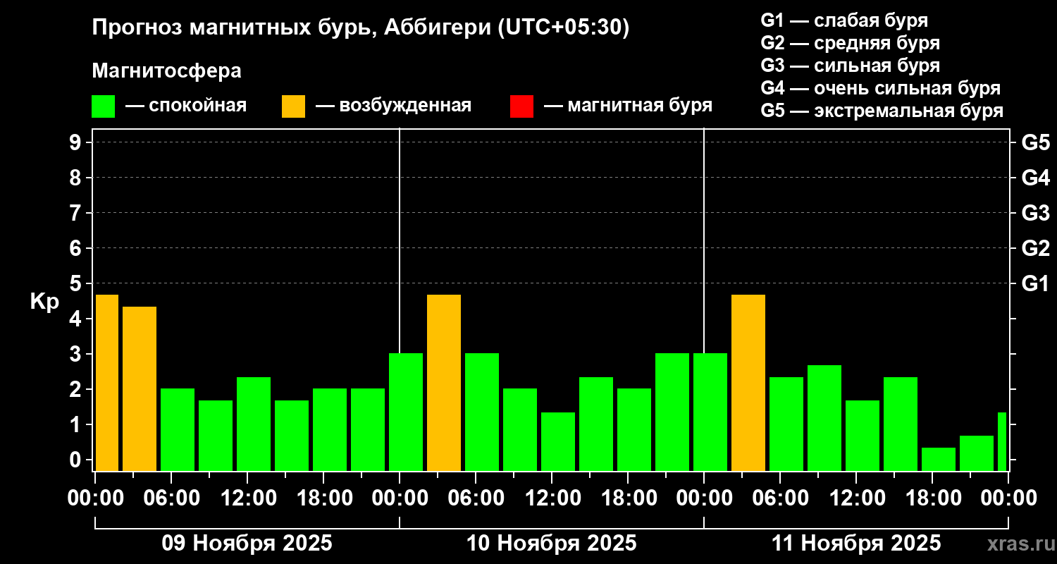 Прогноз магнитных бурь Аббигери — 9 ноября 2025 года