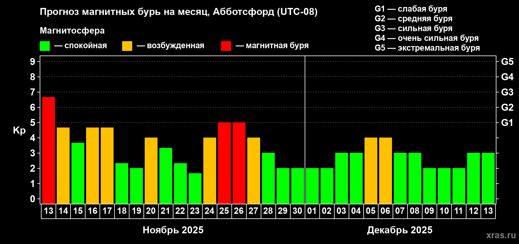 Прогноз магнитных бурь в Абботсфорде на 13 ноября 2025 года