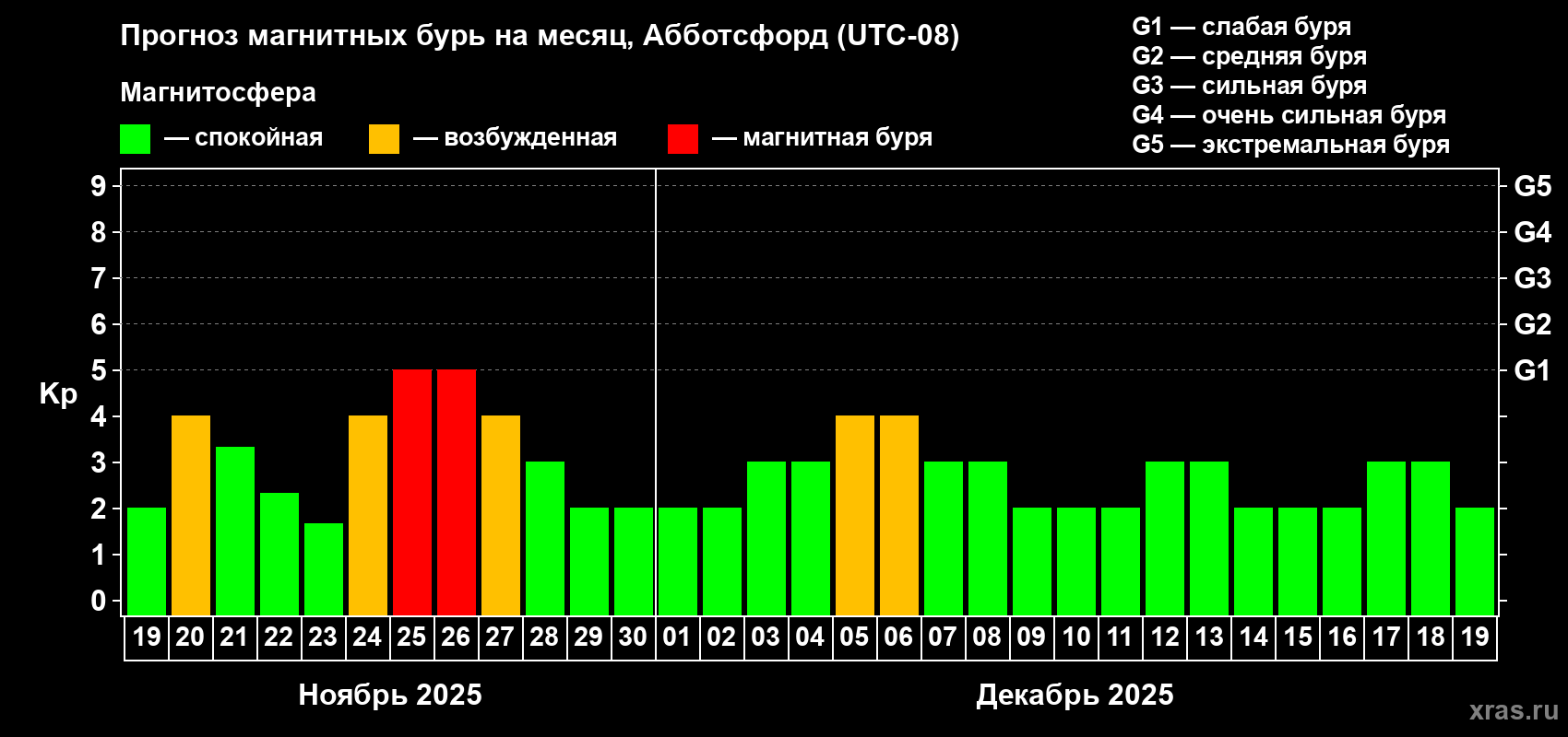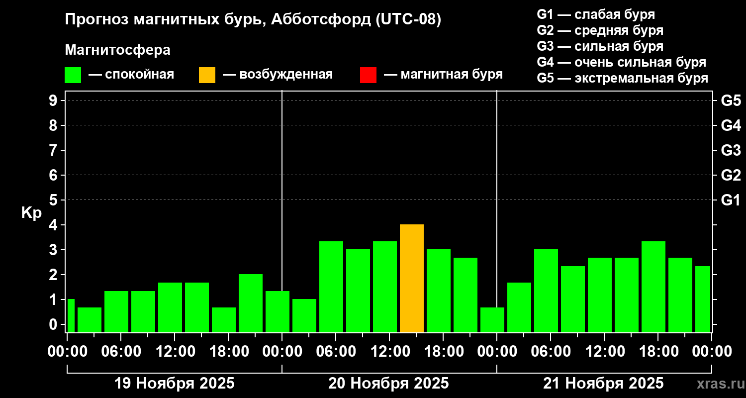Прогноз магнитных бурь в Абботсфорде — 19 ноября 2025 года