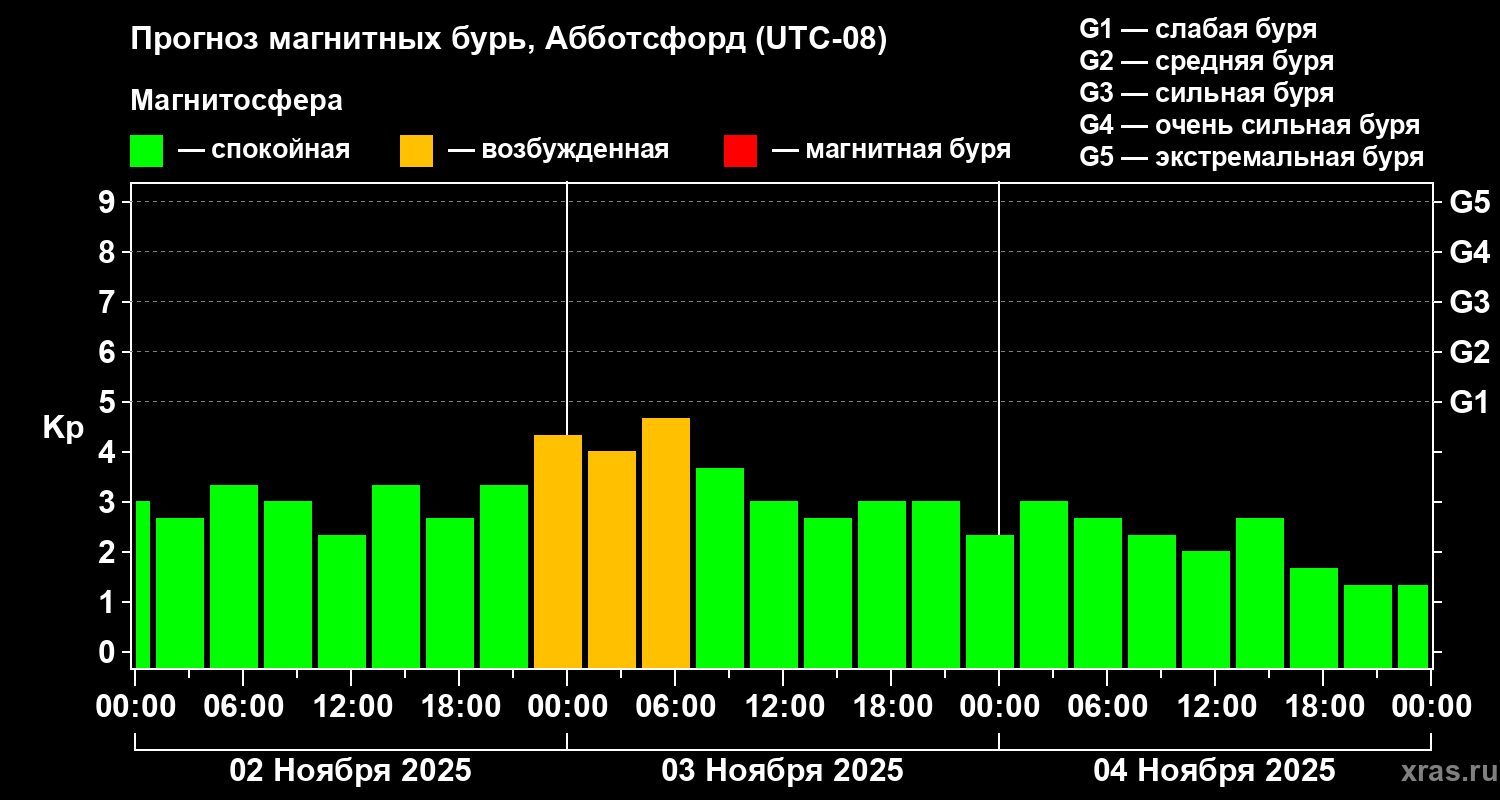 Прогноз магнитных бурь в Абботсфорде на 2 ноября 2025 года