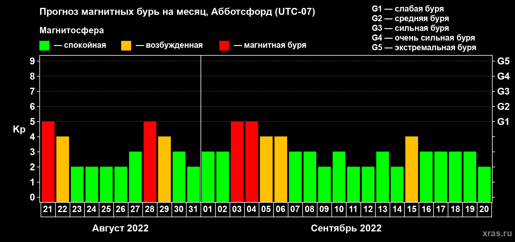 Прогноз магнитных бурь в Абботсфорде — 21 августа 2022 года