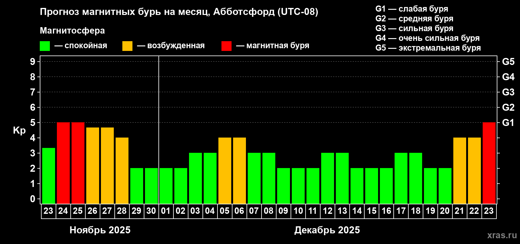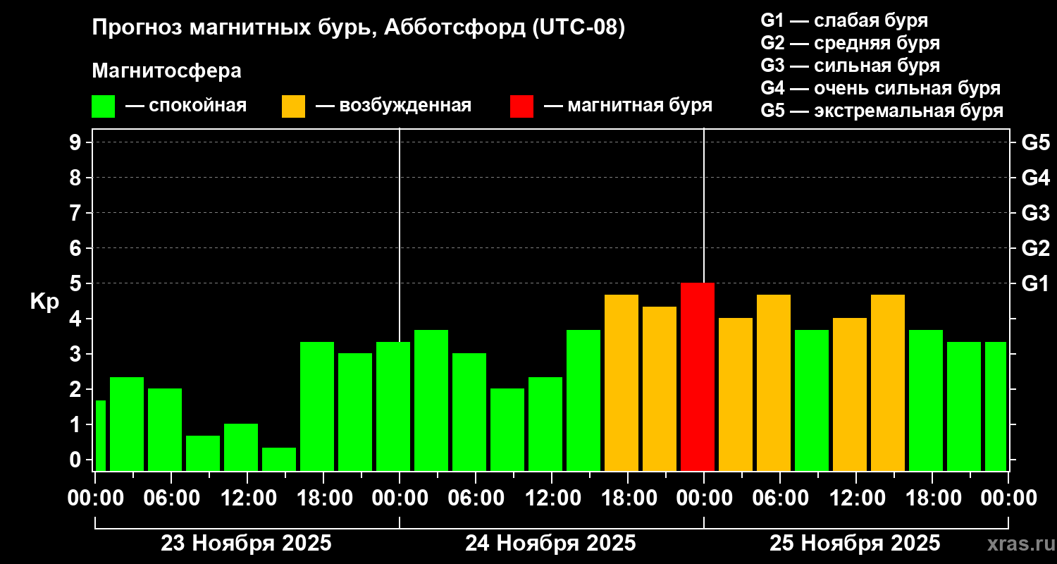Прогноз магнитных бурь в Абботсфорде — 23 ноября 2025 года