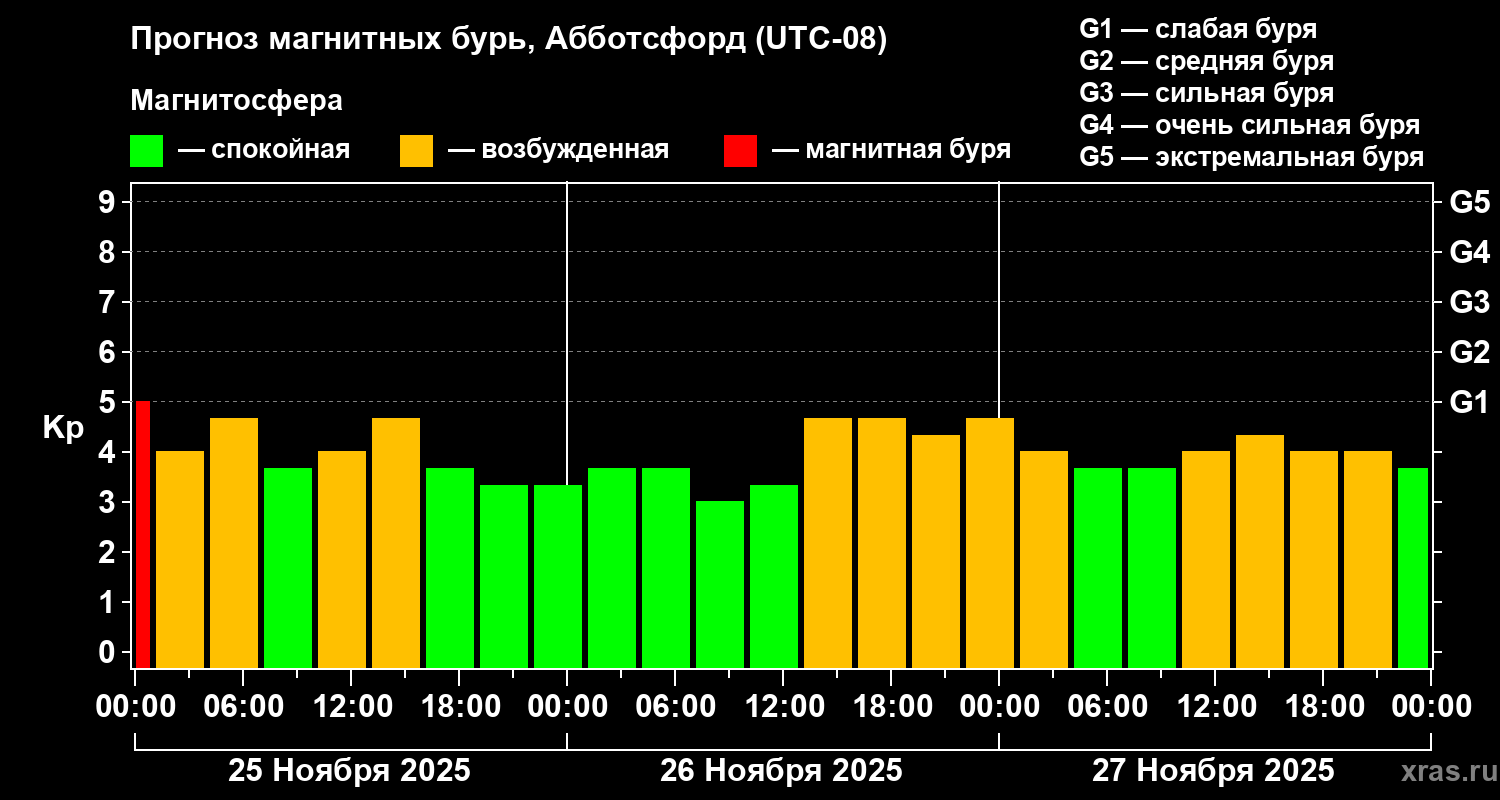 Прогноз магнитных бурь в Абботсфорде — 25 ноября 2025 года
