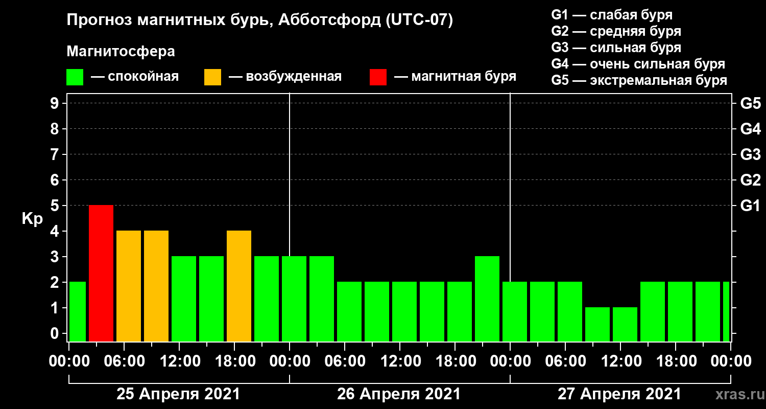 Прогноз магнитных бурь в Абботсфорде на 25 апреля 2021 года