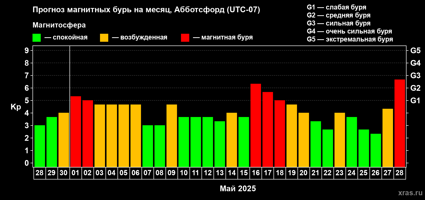 Прогноз магнитных бурь в Абботсфорде — 28 апреля 2025 года