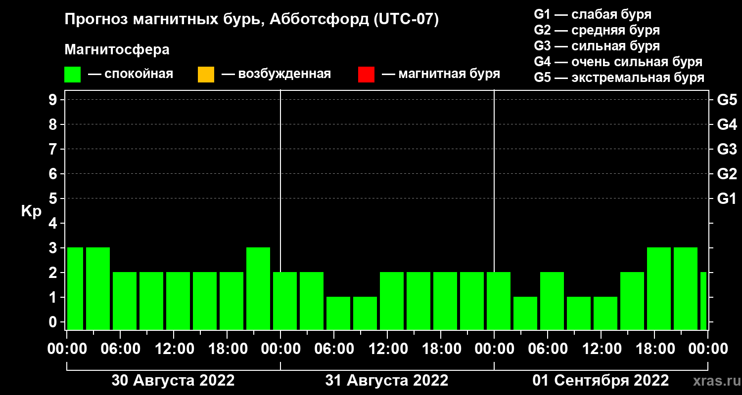 Прогноз магнитных бурь в Абботсфорде на 30 августа 2022 года