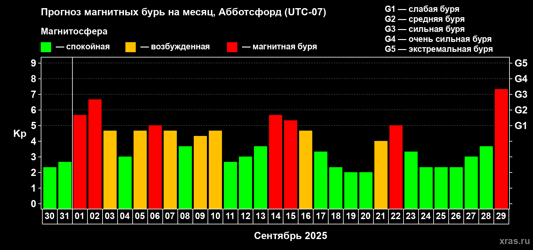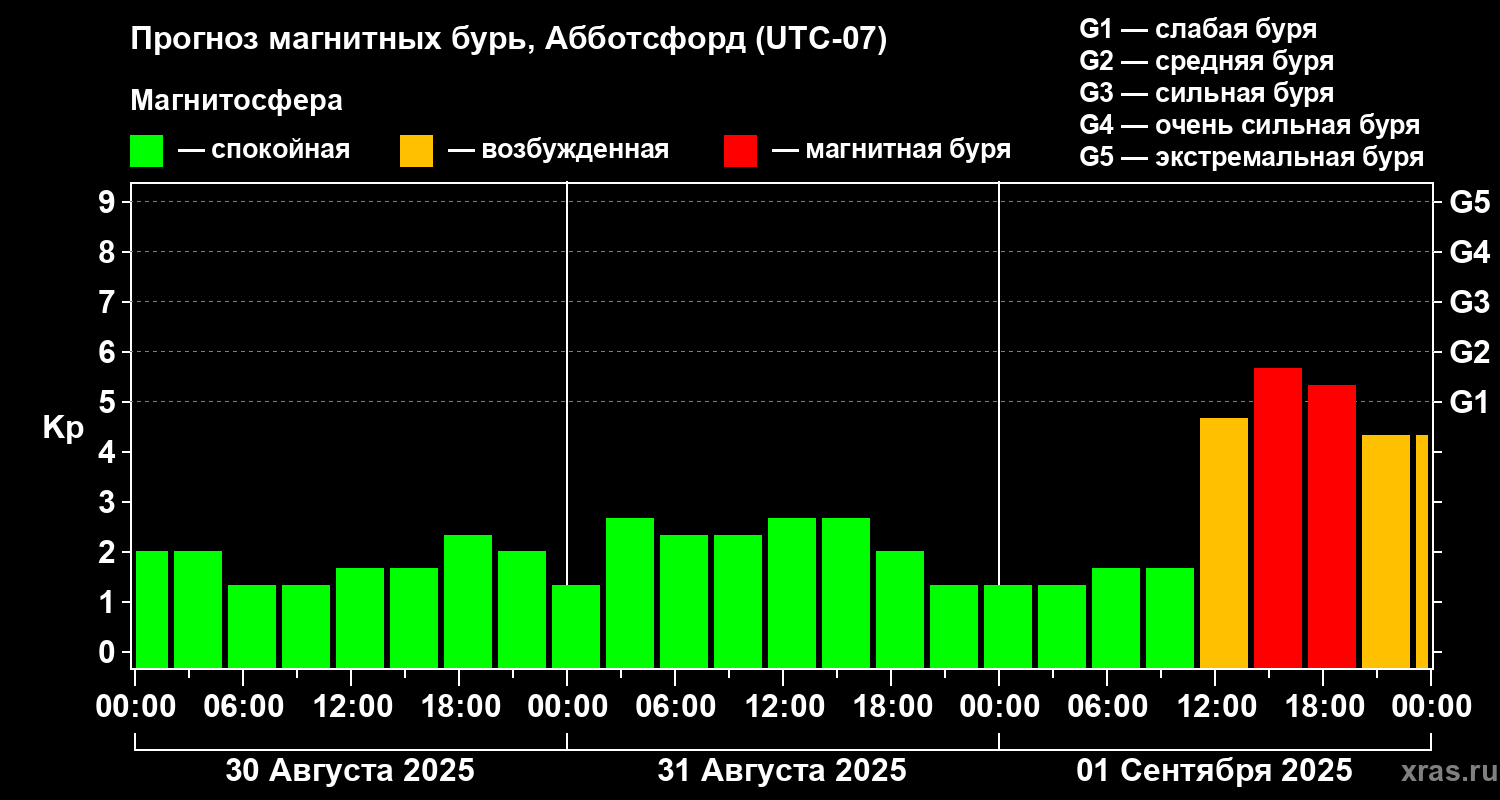 Прогноз магнитных бурь в Абботсфорде — 30 августа 2025 года