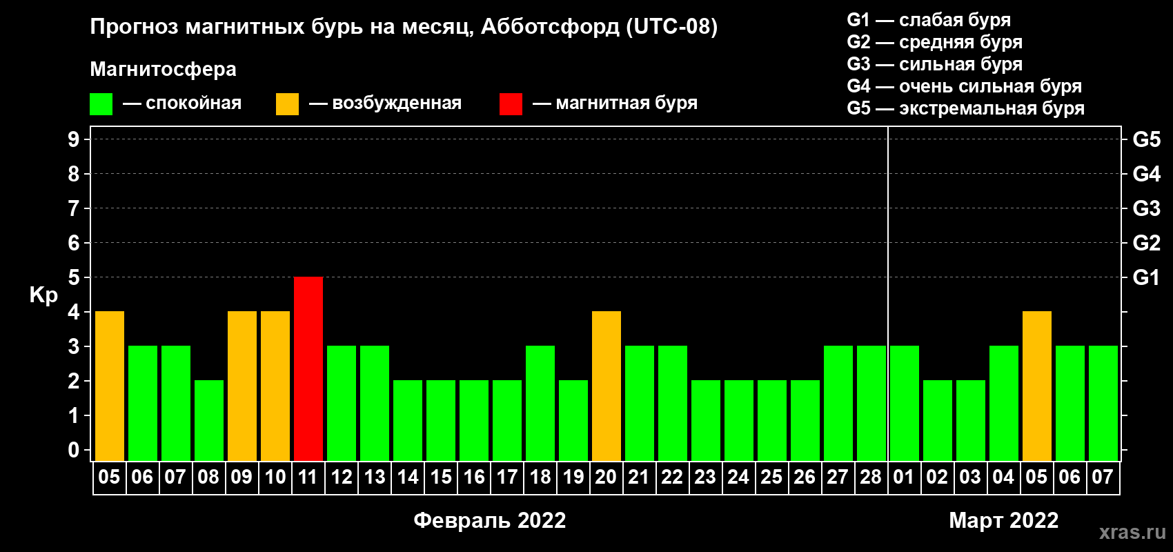 Прогноз магнитных бурь в Абботсфорде на 5 февраля 2022 года