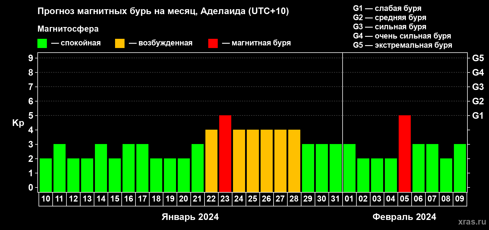 Прогноз магнитных бурь в Аделаиде — 10 января 2024 года