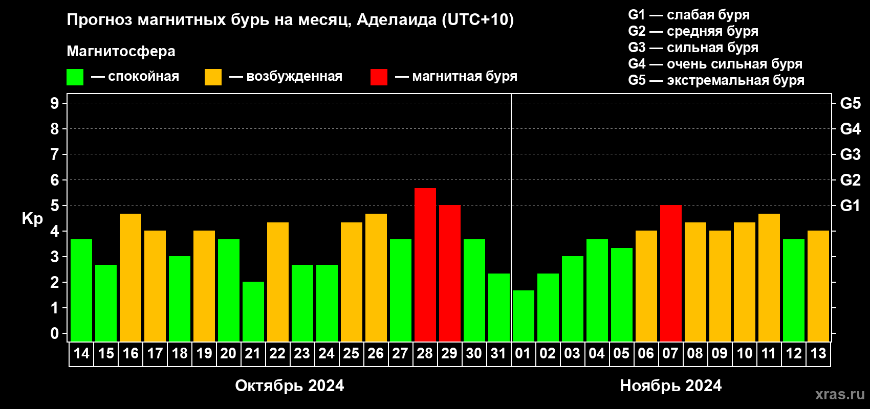 Прогноз магнитных бурь в Аделаиде — 14 октября 2024 года