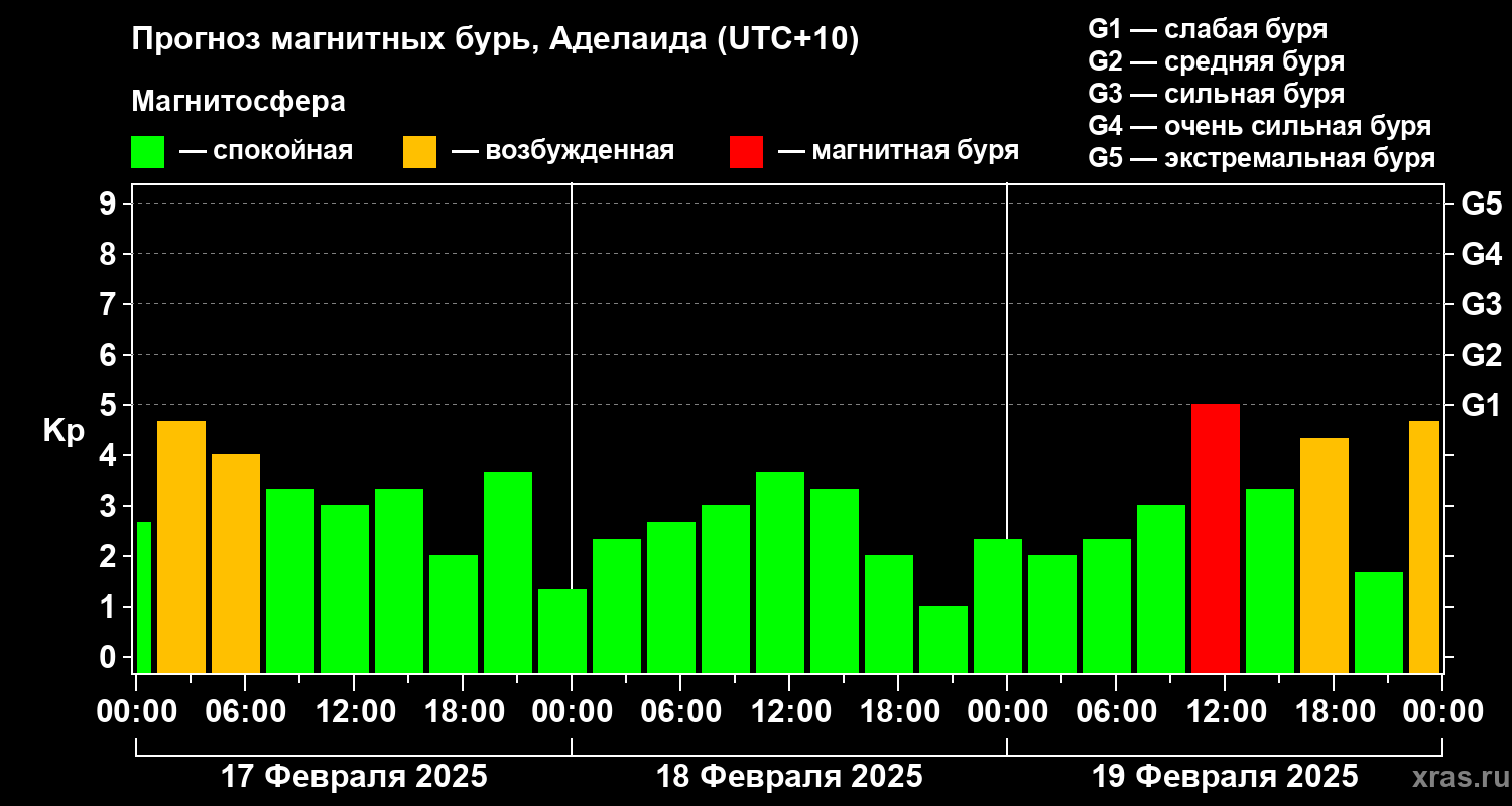 Прогноз магнитных бурь в Аделаиде — 17 февраля 2025 года