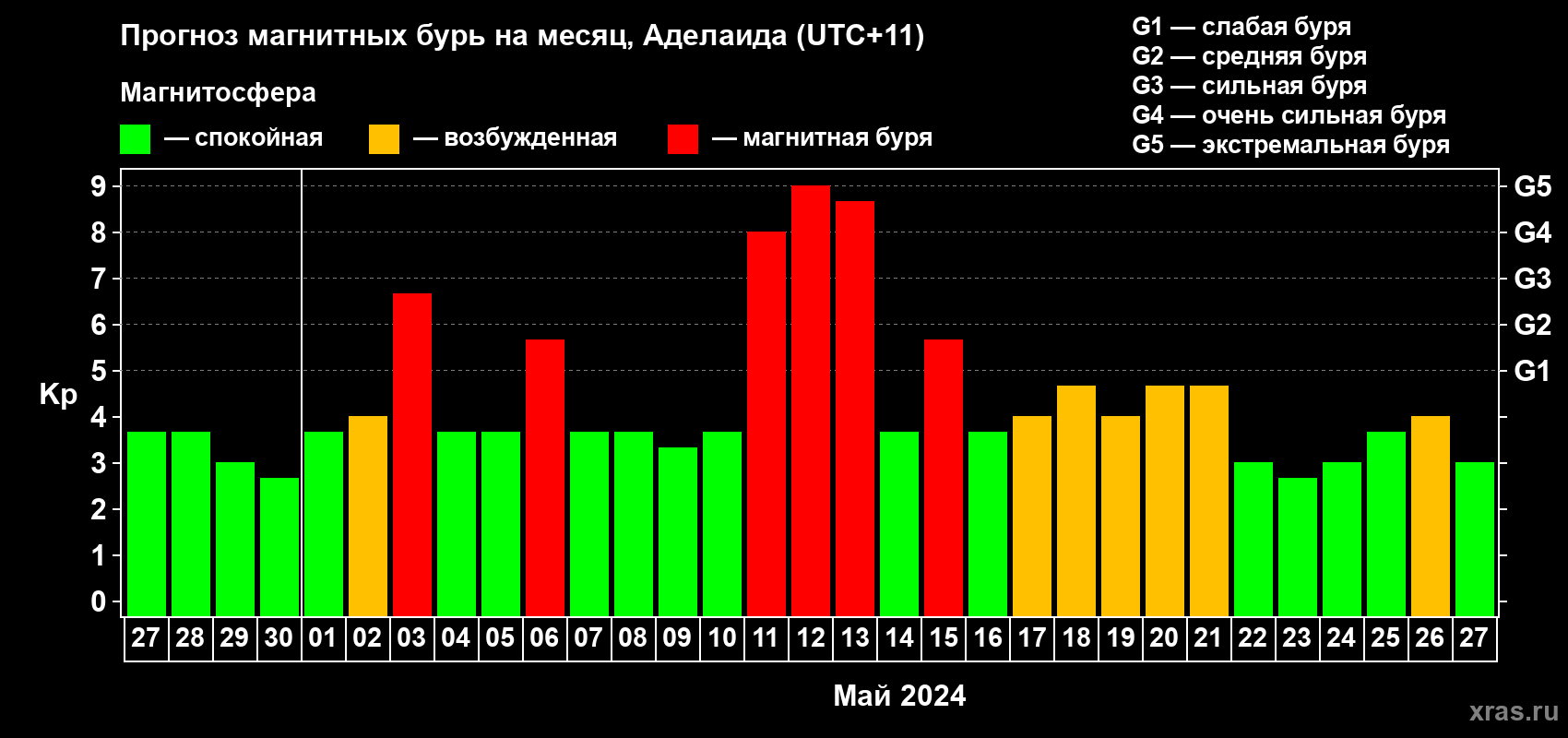 Прогноз магнитных бурь в Аделаиде — 27 апреля 2024 года