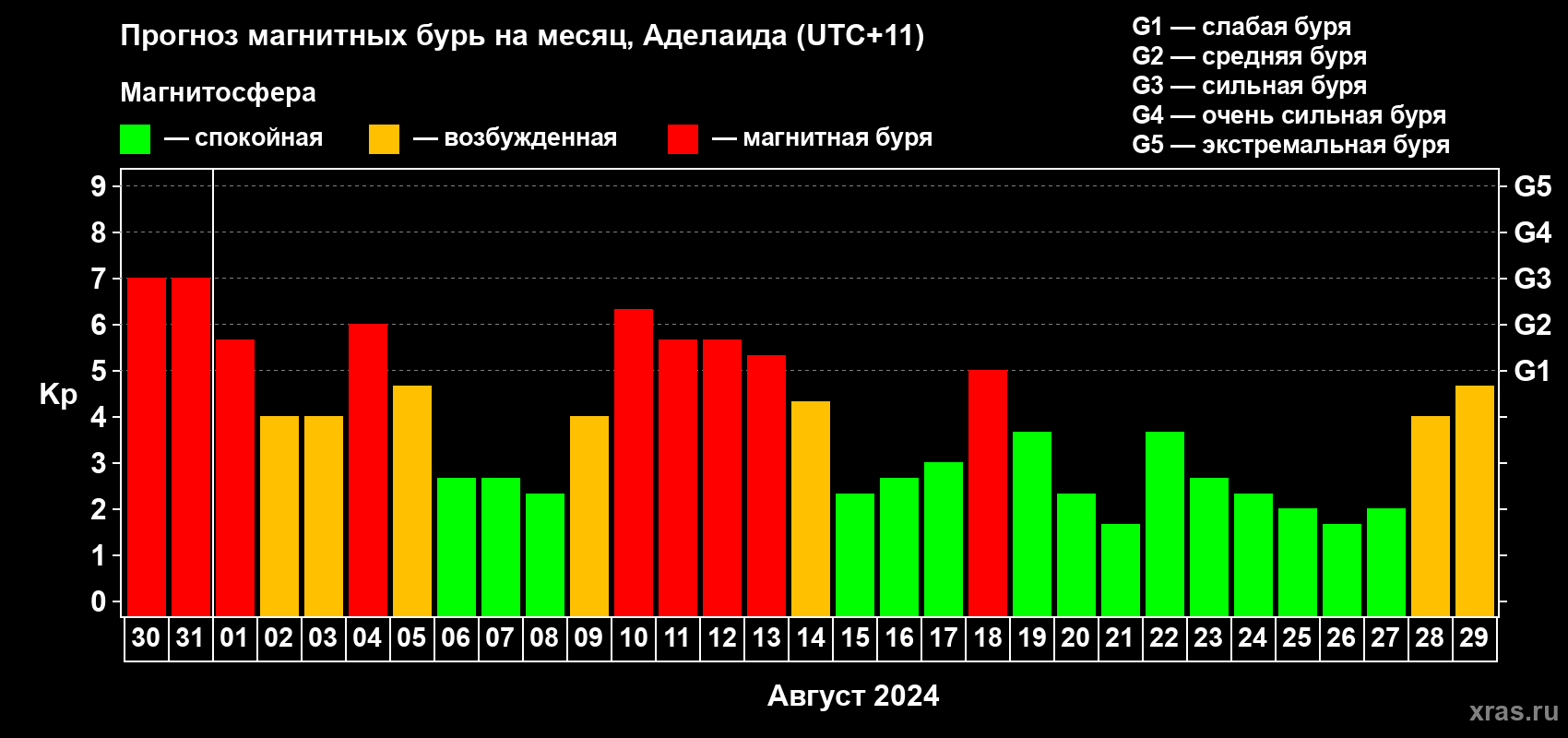 Прогноз магнитных бурь в Аделаиде — 30 июля 2024 года
