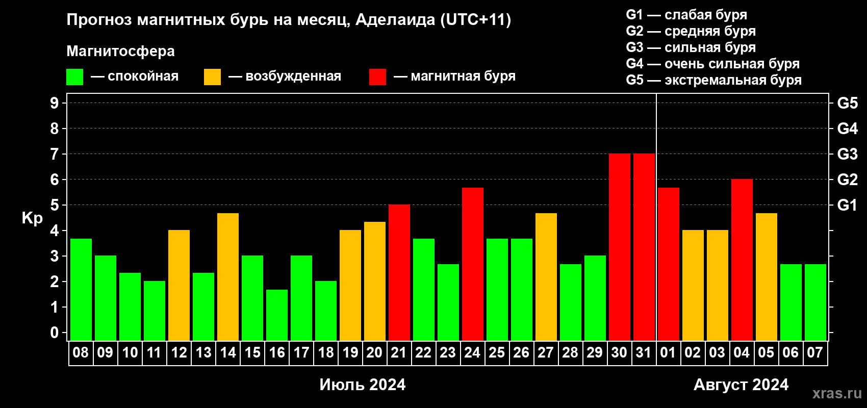 Прогноз магнитных бурь в Аделаиде — 8 июля 2024 года