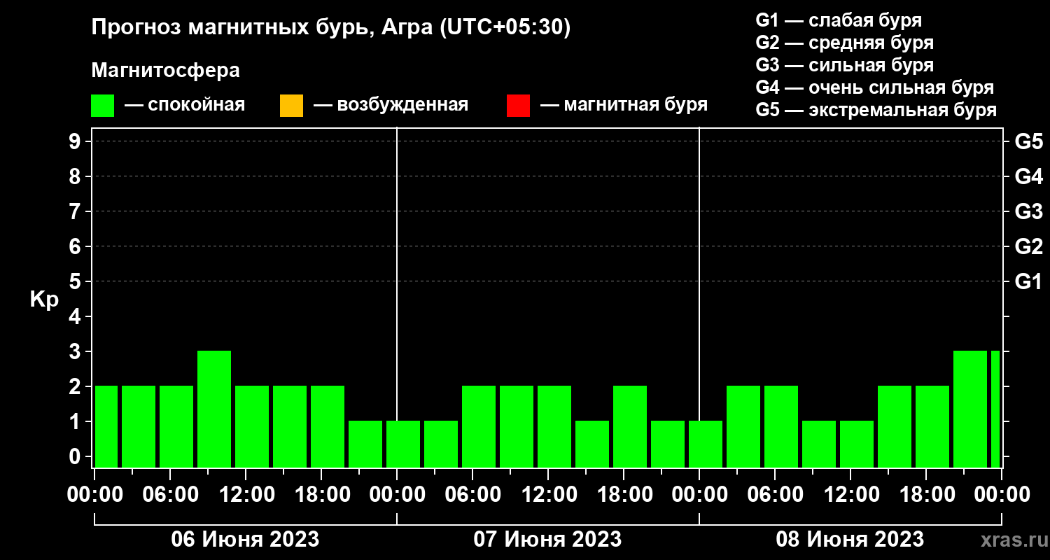 Прогноз магнитных бурь в Агре — 6 июня 2023 года