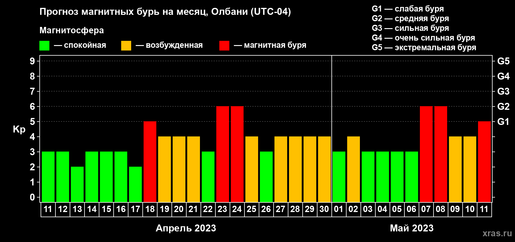 Прогноз магнитных бурь Олбани на 11 апреля 2023 года