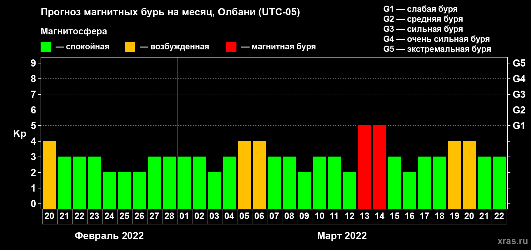 Прогноз магнитных бурь Олбани на 20 февраля 2022 года