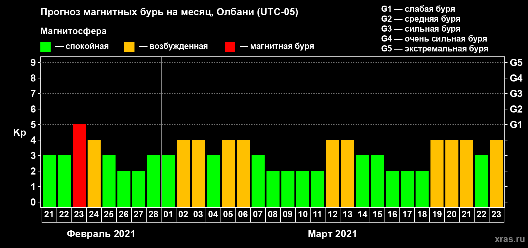 Прогноз магнитных бурь Олбани на 21 февраля 2021 года