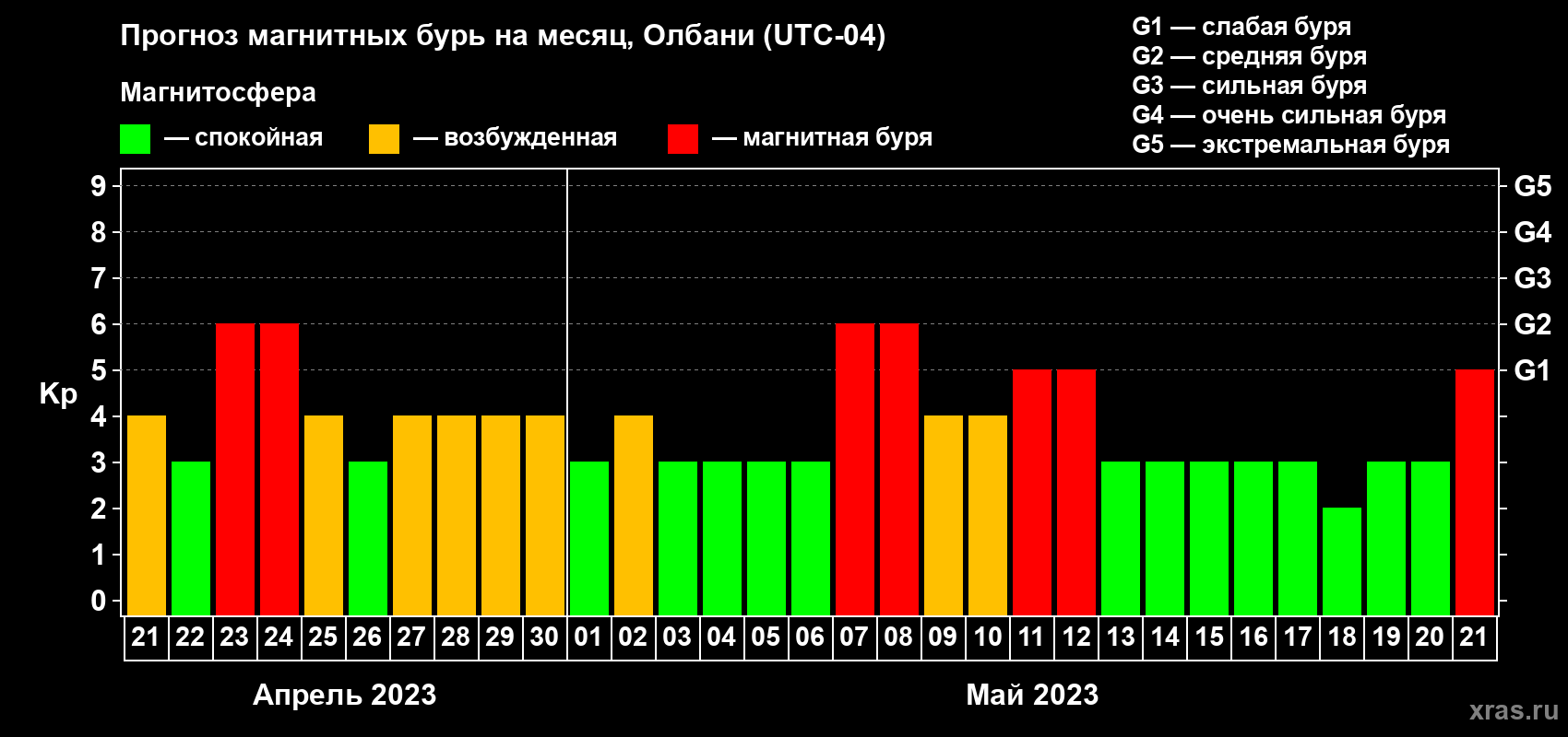 Прогноз магнитных бурь Олбани на 21 апреля 2023 года