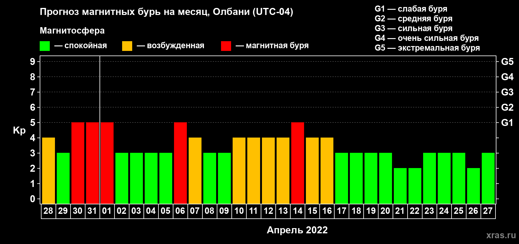 Прогноз максимального суточного геомагнитного индекса Kp на 1 месяц (31 день) с 28 марта по 27 апреля 2022 г