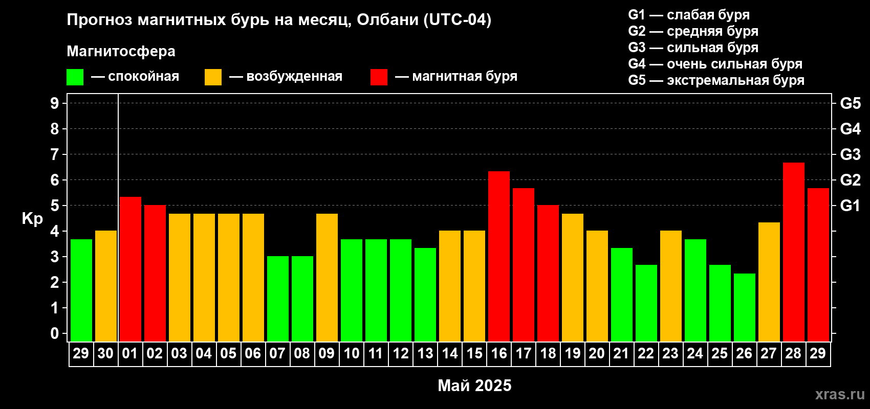 Прогноз магнитных бурь Олбани на 29 апреля 2025 года