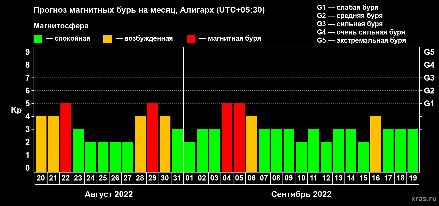 Прогноз магнитных бурь в Алигархе на 20 августа 2022 года