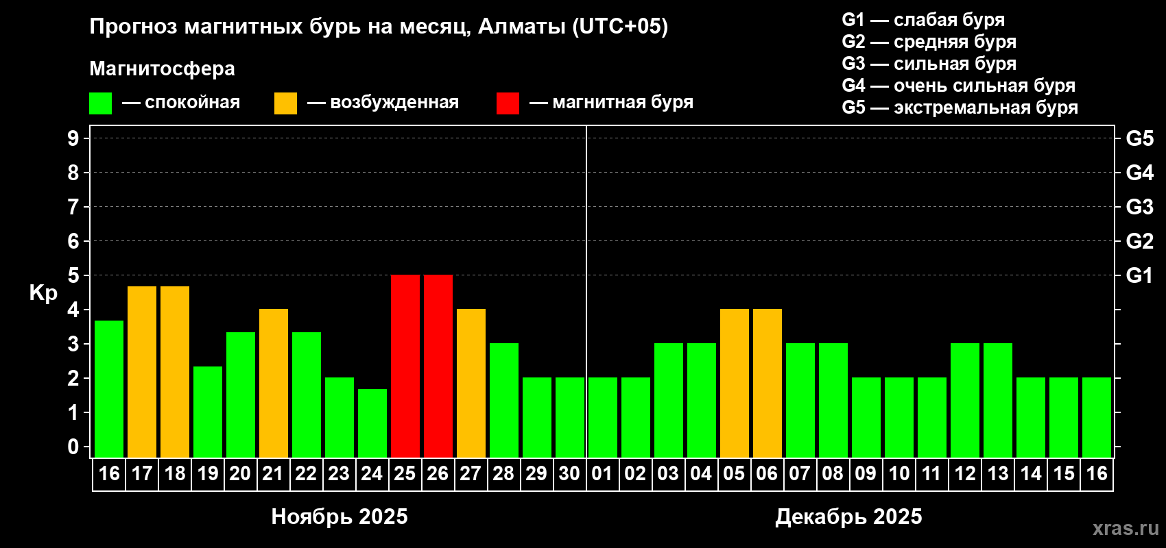 Прогноз магнитных бурь Алматы на 16 ноября 2025 года