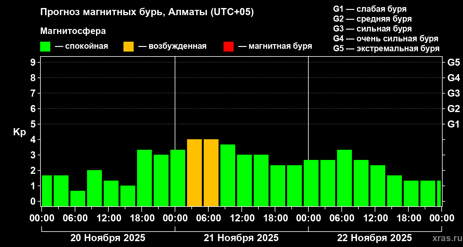 Прогноз магнитных бурь Алматы на 20 ноября 2025 года