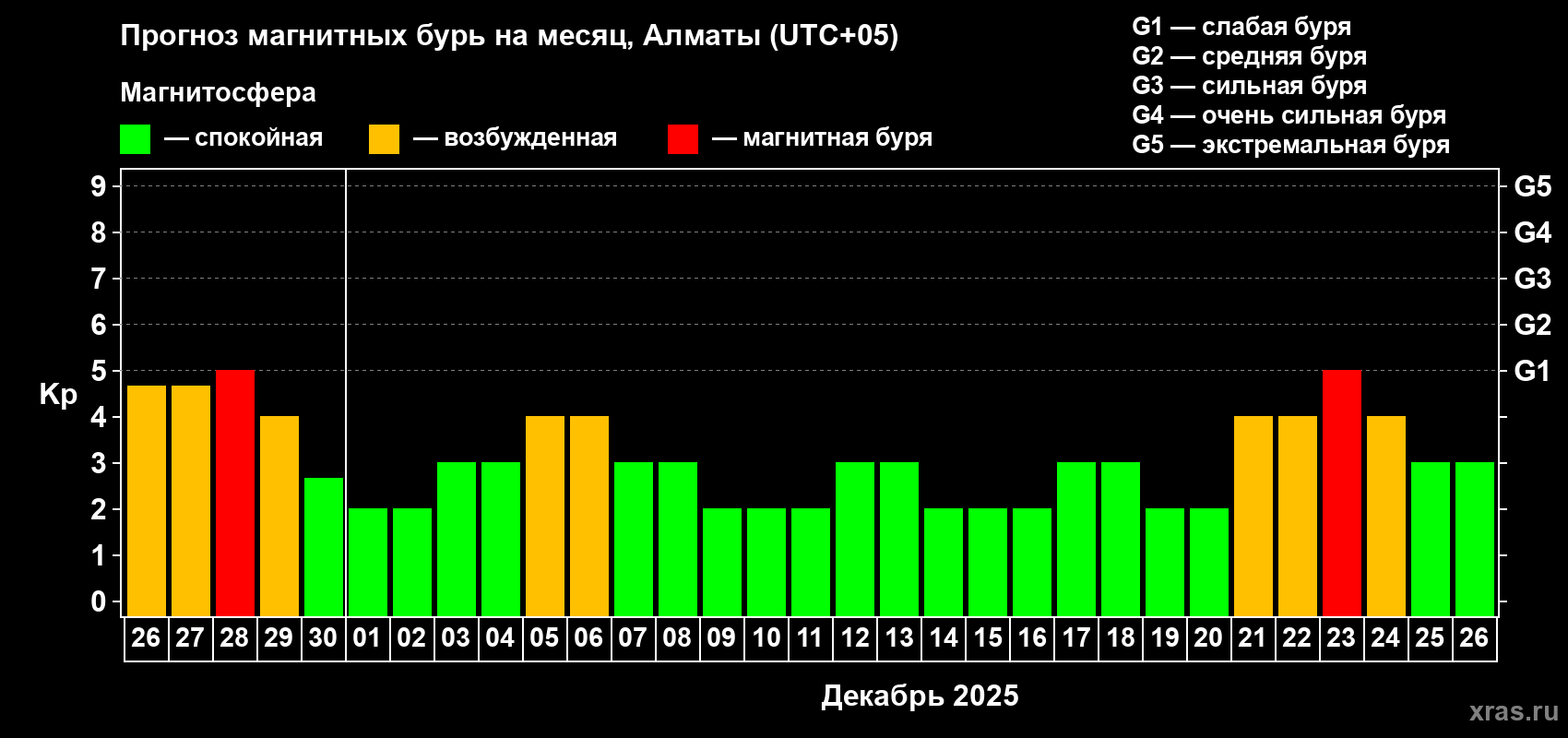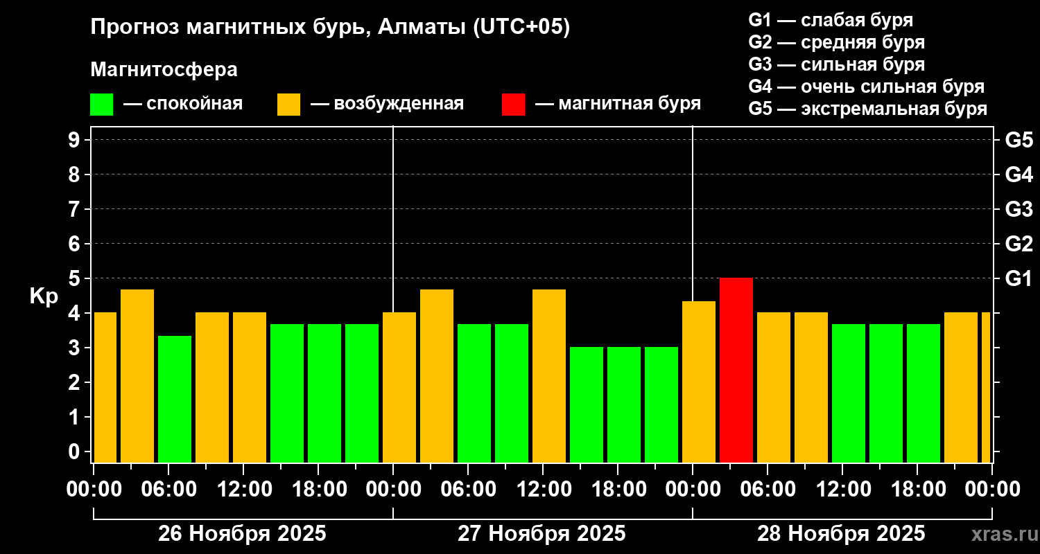 Прогноз магнитных бурь Алматы на 26 ноября 2025 года