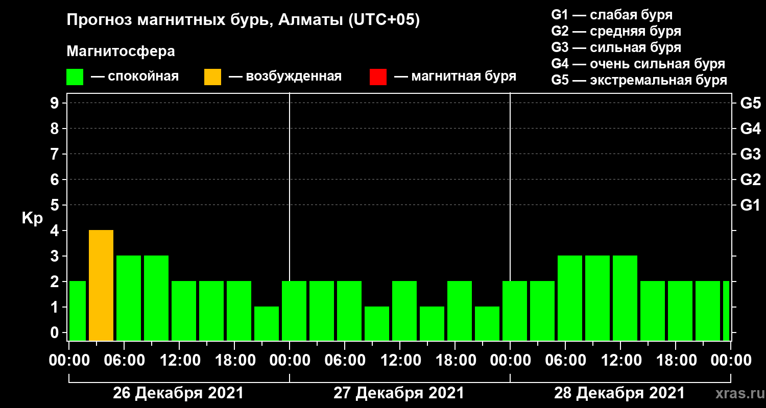 Прогноз магнитных бурь Алматы на 26 декабря 2021 года